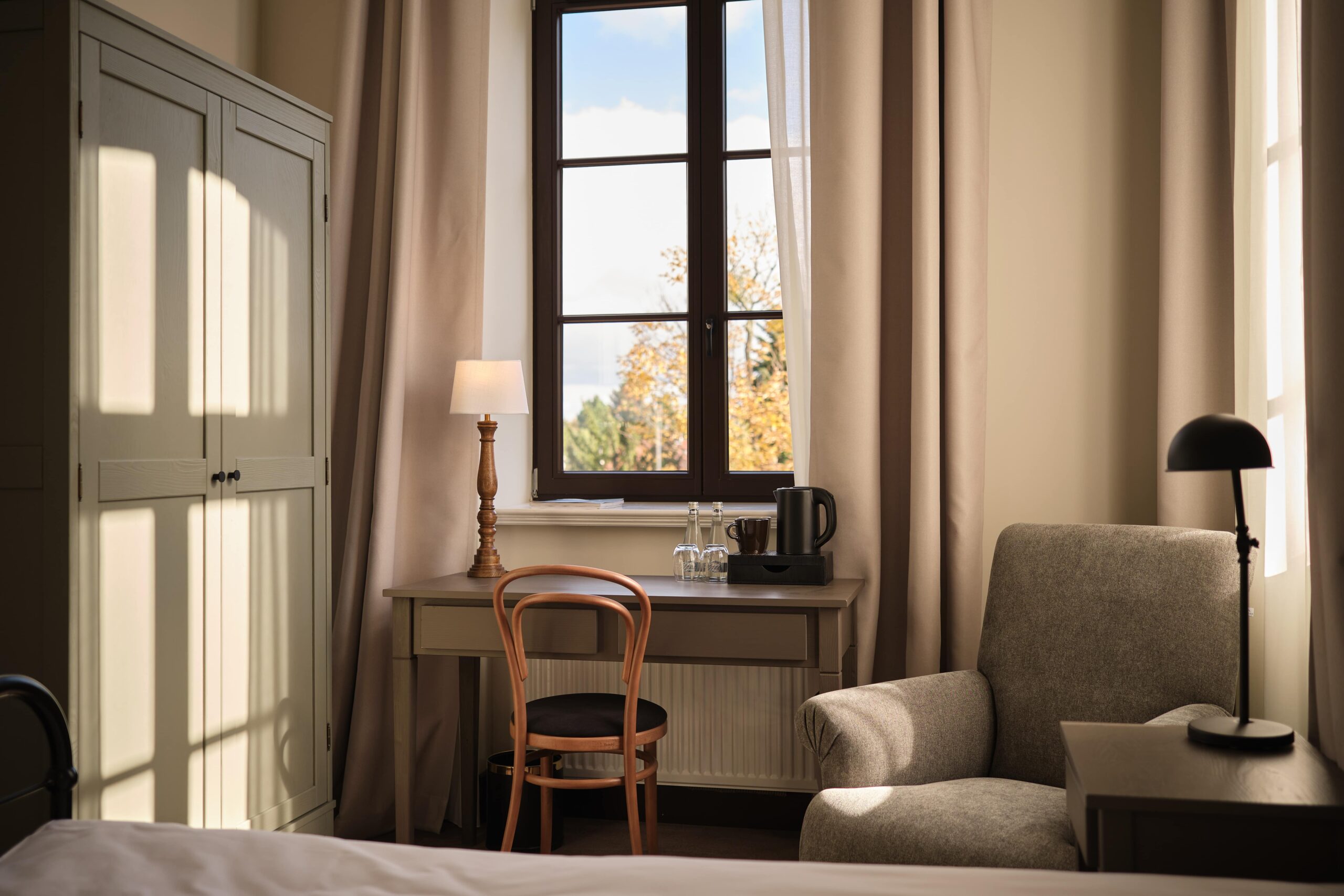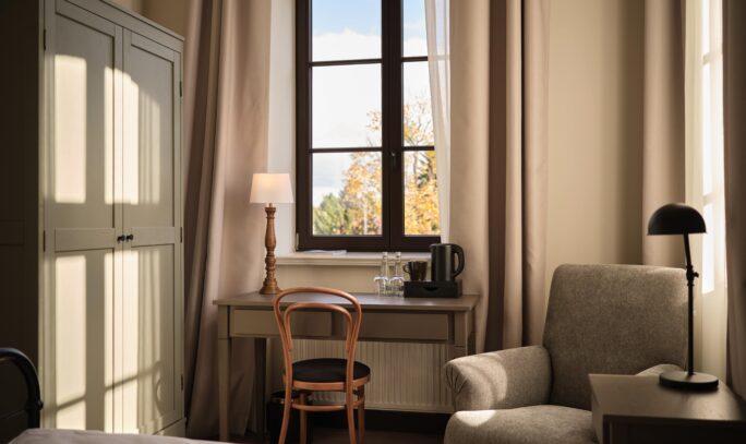 Zabytkowy budynek klasztoru został starannie odrestaurowany pod nadzorem konserwatora zabytków, z zachowaniem oryginalnych materiałów i detali, takich jak cegła, kafle, drewniane schody, rzeźby, tynki oraz charakterystyczne sklepienia i duże okna z widokiem na przyklasztorny park. Historyczne wnętrza harmonijnie łączą autentyczny klimat z nowoczesnym wyposażeniem i funkcjonalnością.